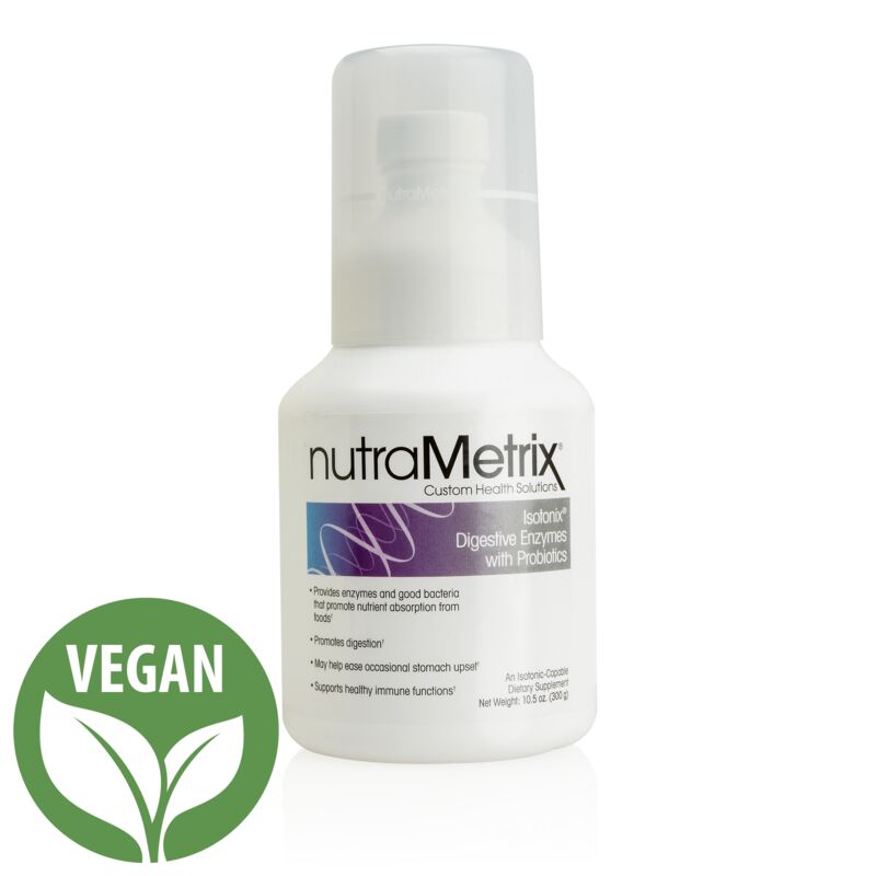 nutraMetrix Ultimate Aloe™ contains more than 200 nutrients, including enzymes, vitamins and essential minerals needed for good nutrition. Studies have shown that aloe consumed orally promotes normal digestion and supports a healthy immune system.* nutraMetrix® Isotonix Digestive Enzymes helps your body break down food to utilize the complete spectrum of nutrients, resulting in a more complete digestive process and better nutritional absorption. The addition of probiotics helps promote a healthy intestinal tract environment.*